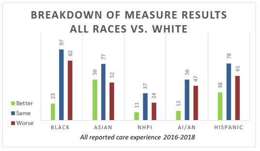 Between all reported races in comparison to whites, the report shows 141 measures where better care was received, 345 measures where the same care was received, and 266 measures where worse care was received.[3]