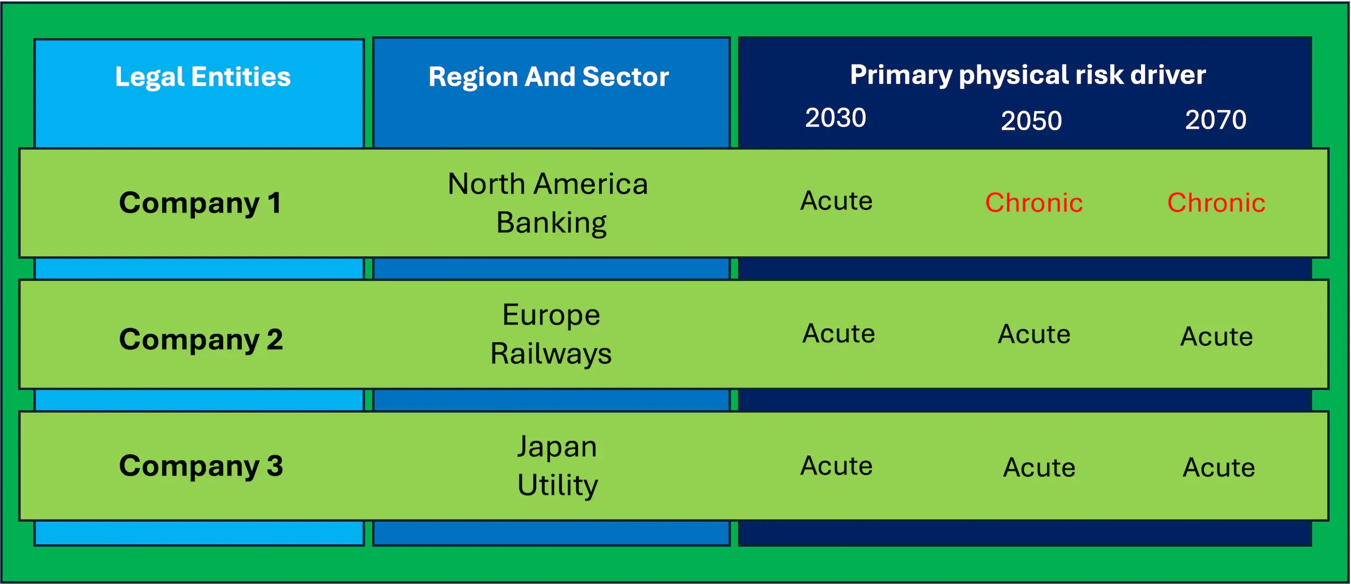 The generation of natural hazard distributions for each geographical area on the planet over different time horizons is only one (complex) part of the physical risk assessment jigsaw. Like in traditional financial risk management, it is also critical to identify and measure factor exposures on the balance sheet structure of a firm, or on the overall positions held by an investment fund. For climate physical risk, it means identifying geographical positions of physical assets owned or operated by a firm, and all portfolio companies, which is difficult enough for publicly traded firms. In line with long-term investors’ appetite for “alternatives,” it is also important to include physical exposures from private investments using proprietary asset data. These assets can include commercial buildings, data centers, toll bridges, railways or power-generating assets such as solar or wind farms. Similar to financial engineers needing to select suitable pricing models to compute factor sensitivities of loans, bonds or equities, climate risk assessment requires process owners to source new data in the form of detailed geographical exposures across legal entities. As shown in Fig.2 below, the collection of granular physical asset data and leverage of large-scale natural hazard distributions should allow investment stakeholders to better understand likely climate impacts over various time horizons. The simulation results can also be used to identify primary risk drivers, shifts between acute and chronic hazard impacts and asset-stranding risks across regions and industries.