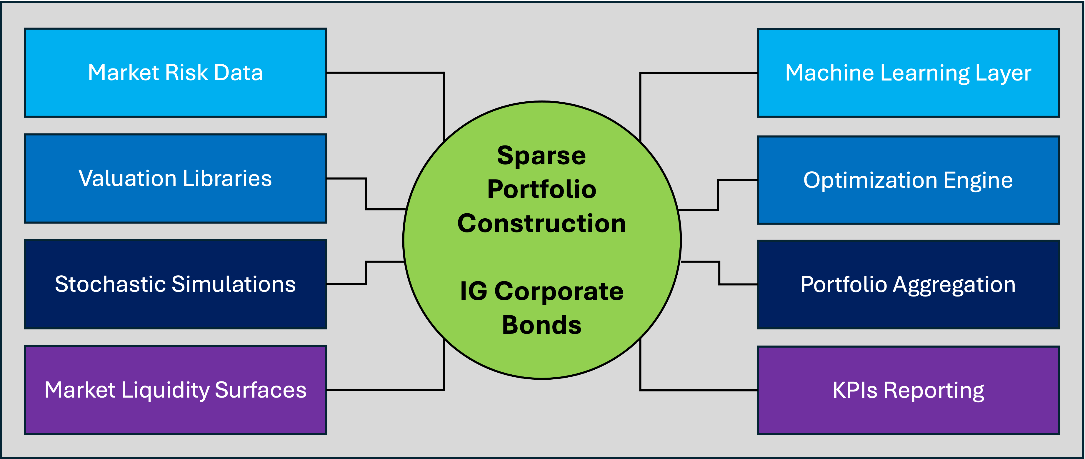 Our previous "ETFs – Machine Learning-Enhanced Sparse Portfolio Construction" research report delved into the impact of using various machine learning (ML) techniques and/or “conventional” optimization algorithms on small dimensionality (sparse) corporate bond portfolios. Confined to market risk considerations, this initial study highlighted functional and technical benefits of adding an unsupervised learning transformation layer to our original tracking error (TE) optimization process. In the next phase of this research, the investment universe was increased to cover a broader set of corporate bond instruments. The modeling outcomes better reflect the large-scale nature of popular indices ETF bond managers choose to track. A new risk type was also included, with market liquidity considerations added to the sparse portfolio construction process (Figure 1).