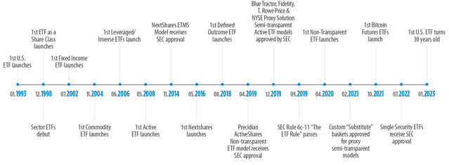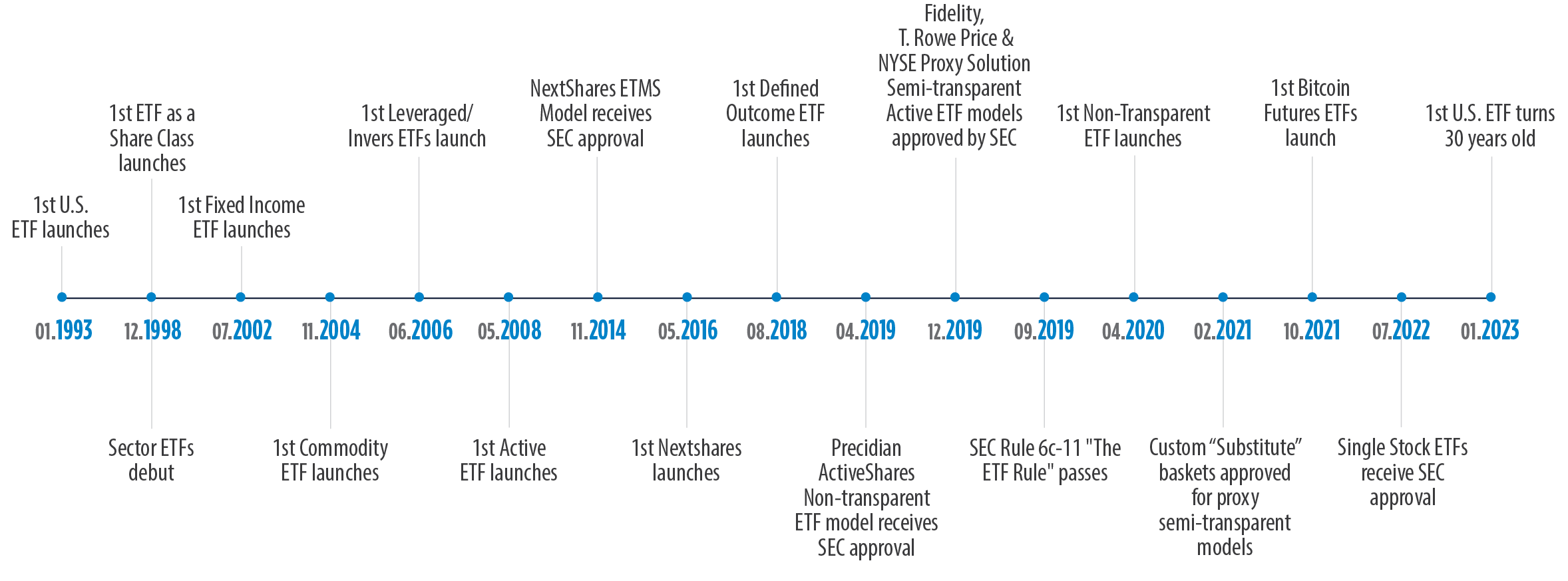 Now, some 30 years later, there are more than 3,000+ ETFs on the market, and as of December 31, 2022, they hold over $6.5 trillion in assets under management. As the distributor for the first U.S. ETF, SS&C ALPS has been there since the beginning, and we continue to be an experienced thought leader in the industry. Below is a timeline of the history of ETFs.
