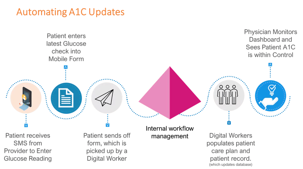 If you are considering adding RPA, SS&C is a leader in the field with Blue Prism. The following example illustrates how digital workers can automate A1C updates, enabling a workflow directly from a patient to a provider.