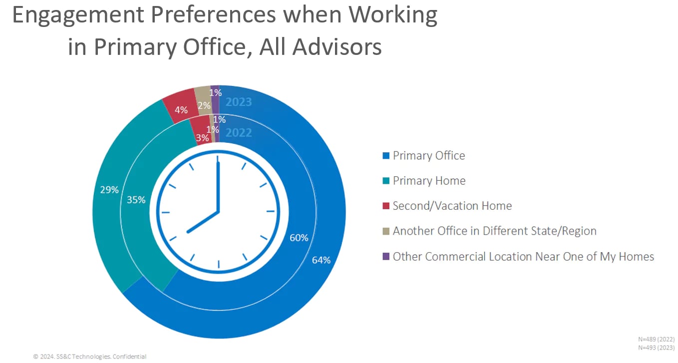 Financial intermediaries reported in 2023 spending two-thirds of their work time in an office, according to SS&C’s 2023 “What Advisors Do Online” survey, conducted in association with Horsesmouth. When they are there, 44% of advisors say that their preference for engaging with wholesalers is via an in-person meeting. That is up 13 percentage points from 2022, when 31% of advisors preferred in-person meetings when they are working in the main office. Demand for virtual meetings and phone meetings had slight declines between 2022 and 2023.