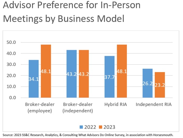 The significant rise overall in advisors’ preference for in-person meetings obscures some significant variation in interest among various advisor business models. For example, a significantly higher share of employees of broker-dealers and hybrid RIAs prefer in-person meetings when in the office than independent RIAs. Not surprisingly, independent RIAs planned to spend the least amount of their work time in the office (54.6%), as compared to 74.1% of broker-dealer employees’ time.