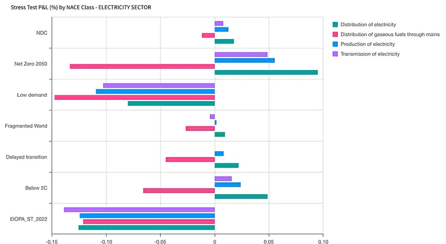 Figure 1: Comparing impact of granular calculation of NGFS scenarios (NDC, NZ50, Low Demand, Fragmented World, Delayed Transition, <2C) vs a "traditional" stress test (EIOPA 2022) in the electricity sector. While the traditional approach results in similar adjustments for all 4 subsectors, the NGFS scenarios, calculated here using “Algo Climate Scenarios for Transition Risk, powered by CLIMAFIN”, shows instead high variations. Under most policy trajectories, different subsectors take a mixture of positive and negative adjustments, as the impact depends on the specific activity and technology. The graphic has been generated with the Algo Workspace Analyzer