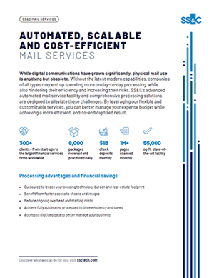 SS&C's advanced mail services integrates the latest technology to streamline processing, helping you reduce costs, enhance efficiency and achieve a fully digitized, end-to-end workflow.