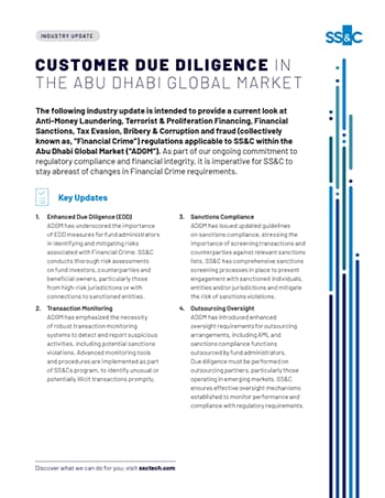 With extensive expertise in fund administration and operational services, SS&C is your trusted partner in navigating ADGM’s regulatory requirements. Our local team in the UAE is ready to support your compliance needs with tailored solutions and industry-leading technology.